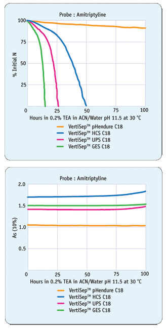 Dissolution of silica will occurs and causes tailing peaks under basic conditions with conventional silica-based column. VertiSep pHendure with the hybrid particle based packings solves this problem and provides excellent stability under basic conditions offering symmetrical peaks.